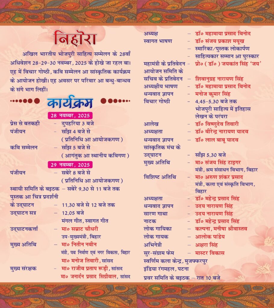 सम्मेलन के कार्यवाही का बारे में निहोरा में विस्तार से सबकुछ सूची बद्ध कइल बा. बाकिर भारतीय जनता पार्टी के प्रवक्ता आ आयोजन समिति के अध्यक्ष एमएलसी डॉ संजय मयूख एह सम्मेलन में स्वागत भाषण दीहें आ सम्मेलन के प्रचार तंत्र लागत बा उनुके जिम्मे बा. अखबारन में जवन सामग्री अंजोर भइल बाड़ी सँ आ यूट्यूब पर जवन वीडियो उपलब्ध बाड़ी सँ तवना में मयूख जी मीडिया के एह बारे में जानकारी देत लउकत बानीं. राजनीति में रहला का बावजूद मयूख जी साहित्यो में रुची लिहिलें. सम्मेलन में बिहार सरकार में भाजपा के उप मुख्य मंत्री सम्राट चौैधरी 29 तारीख के उद्घाटन करब आ मुख्य अतिथि रहीहन पथ निर्माण नगर विकास मंत्री नितीन नवीन. श्रम संसाधन मंत्री संजय सिंह टाइगर, कला एवं संस्कृति मंत्री अरुण शंकर प्रसाद, सहित सम्मेलन में सांसद राजीव प्रताप रुडी, सांसद जनार्दन सिंह सिग्रीवाल, सांसद मनोज तिवारी, फिल्म अभिनेत्री अक्षरा सिंह, लोक गायिका कल्पना पटवारी, लोकगायक आलोक पांडेय, मास्टर विकास, उदय नारायण सिंह, कल्पना मिश्रा, मनीषा श्रीवास्तव, डॉ वीरेंद्र नारायण यादव वगैरह के गरिमामय उपस्थिति रहे वाला बा. 30 नवंबर का दिने बिहार में भाजपा के दुसरका उपमुख्यमंत्री विजय कुमार सिंहा, आ कोयला राज्य मंत्री (भारत सरकार) सतीश चंद्र दुबे वगैरह के उपस्थिति रही.