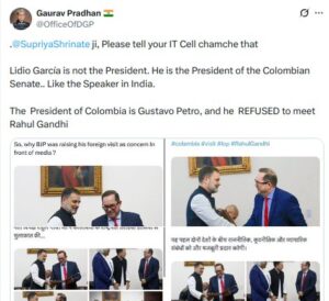 अबहीं हाल ही में कांग्रेस के मालिक नेता राहुल गाँधी के कोलम्बिया के दौरा पर गइला के खबर आइल रहुवे आ कुछ कांग्रेसी नेता दावा कर दिहलें कि ओहिजा उनुकर मुलाकाता कोलंबिया के राष्ट्रपति से भइल. जबकि सचाई ई बावे कि कोलंबिया के राष्ट्रपति राहुल से मिले के तइयारे ना भइलन. कोलंबिया के राष्ट्रपति गुस्तावो पेट्रो हउवन जबकि राहुल के मुलाकात ओहिजा के सीनेट के अध्यक्ष (जइसे कि भारत के लोकसभा अध्यक्ष) लिडिओस गार्सिया से भइल रहुवे. आ उहो इहे कहलन कि भारत के एगो सांसद राहुल गाँधी से जे इन्दिरा गाँधी के पोता हउवन से भेंट भइल. मतलब कि अगर इंदिरा गांधी के पोता ना रहतन त शायद एह मुलकातो के मौका ना दीहल जाईत राहुल गाँधी के. एह विवाद में गौरव प्रधान के ट्वीट नीचे दीहल जा रहल बा जवना से सबकुछ बहुत साफ हो जाई.