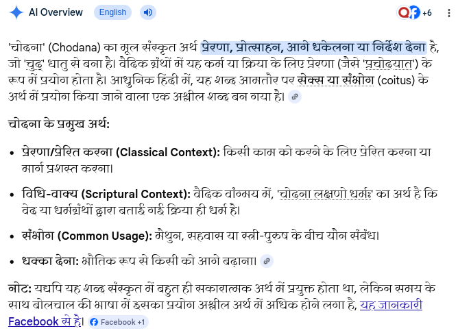 ‘चोदना’ (Chodana) का मूल संस्कृत अर्थ प्रेरणा प्रोत्साहन, आगे धकेलना या निर्देश देना है, जो ‘चुद्’ धातु से बना है। वैदिक ग्रंथों में यह कर्म या क्रिया के लिए प्रेरणा (जैसे ‘प्रचोदयात’) के रूप में प्रयोग होता है। आधुनिक हिंदी में, यह शब्द आमतौर पर सेक्स या संभोग (coitus) के अर्थ में प्रयोग किया जाने वाला एक अश्लील शब्द बन गया है।